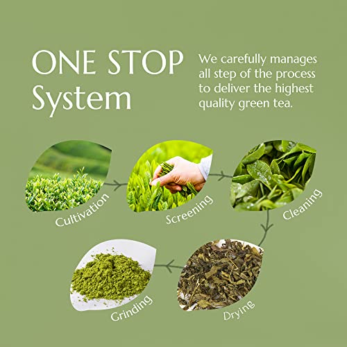 - Organic Green Tea - Our powders are made from the finest organic matcha leaves and are prepared using the One Stop System. We carefully process and manage each step from A-Z ourselves without outsourcing to third party companies.